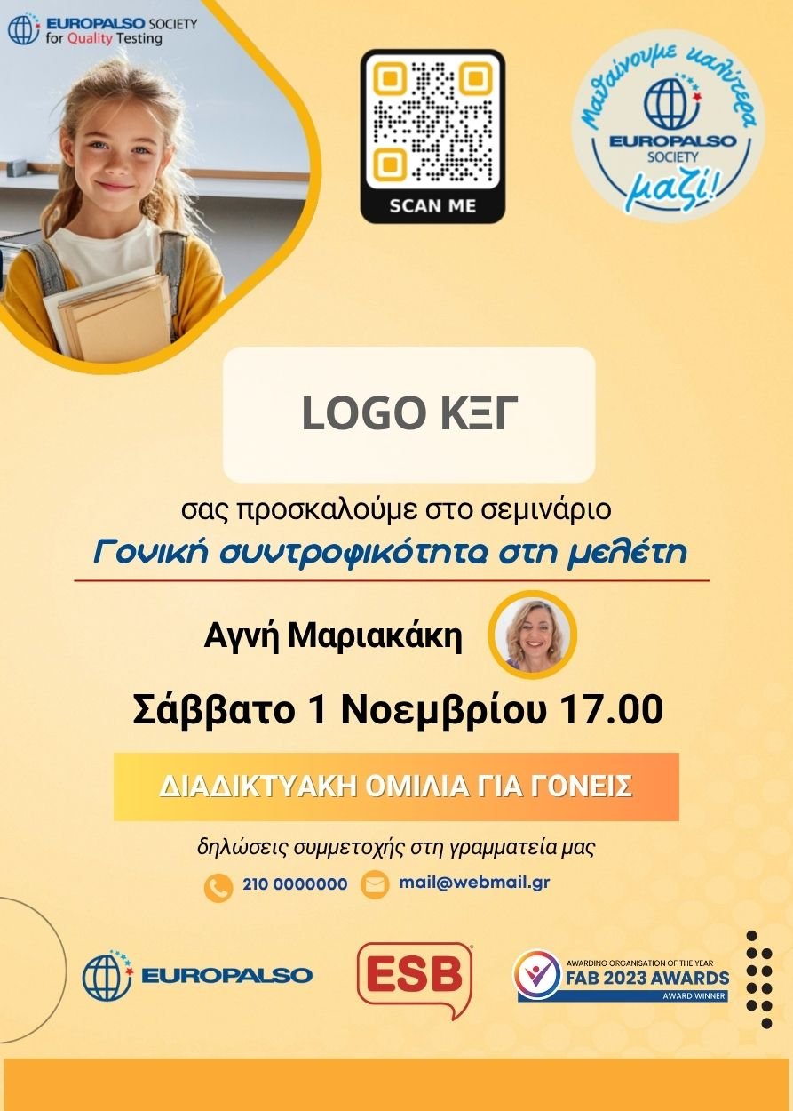 Συνάδελφοι, σας καλούμε να αξιοποιήσετε προς όφελος σας, 1. τo νέο Portal Προβολής ΚΞΓ Europalso Society, για να ενισχύσετε το ψηφιακό σας αποτύπωμα και να προσελκύσετε νέους πελάτες. Για να συμπεριληφθείτε στο νέο portal πατήστε εδώ, 2. τη νέα Διαδικτυακή Διαφημιστική καμπάνια σε Google, Facebook, Instagram, YouTube, TikTok και Threads για τα ΚΞΓ, 3. την αναβαθμισμένη πλατφόρμα E–Europalso για μαθητές και ενήλικες, 4. τις παροχές society: τετράδια, προωθητικά έντυπα, αφίσες και πανό με λογότυπο σας, roll up, φωτεινές ταμπέλες, κ.λ.π., και τις νέες παροχές: Αφίσες ‘Parent Mindset Reset’, ‘Γονική Συντροφικότητα στη μελέτη’, ‘Google myBusiness με QR code’ και την Επαγγελματική κάρτα NFC Google για αύξηση των αξιολογήσεων, 5. Το Webinar Μαριακάκη για γονείς και κηδεμόνες με θέμα Γονική Συντροφικότητα στη Μελέτη.